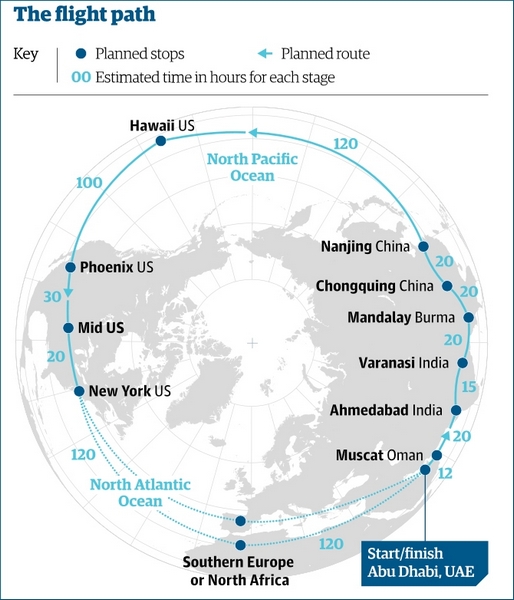 Полёт пройдёт с рядом остановок, которые необходимы для технического обслуживания и полноценного отдыха авиаторов. Ну и, разумеется, в это время экологически чистый летательный аппарат будет демонстрироваться представителям прессы.