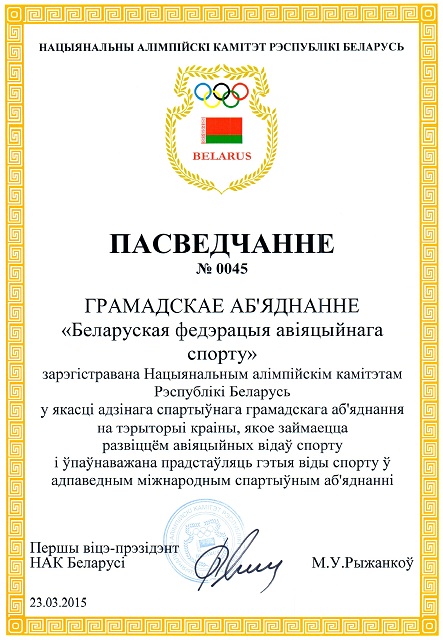 Исполком Национального олимпийского комитета Республики Беларусь постановил признать Общественное объединение "Белорусская федерация авиационного спорта" в качестве единственной спортивной организации, развивающей авиационные виды спорта на территории Республики Беларусь.