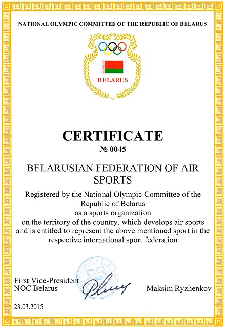 Также Общественному объединению "Белорусская федерация авиационного спорта" предоставлено право представлять Республику Беларусь в соответствующих международных спортивных организациях, признанных Международным олимпийским комитетом.