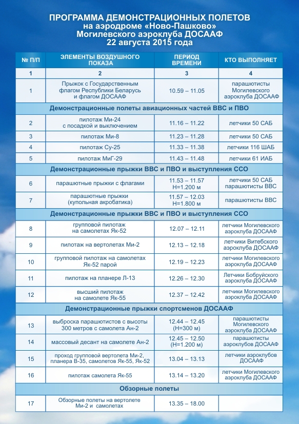 В этот раз авиационная программа праздника по-настоящему насыщенная! Организаторы - ДОСААФ Республики Беларусь - очень постарались. Демонстрационные полеты авиационной техники белорусских ВВС, высший пилотаж самолётов ЯК-52 и ЯК-55, парный пилотаж самолетов ЯК-52, высший пилотаж на планере, прыжки с парашютом, показательные выступления по рукопашному бою - это только малое из того, что могилевчане увидят в этот день!