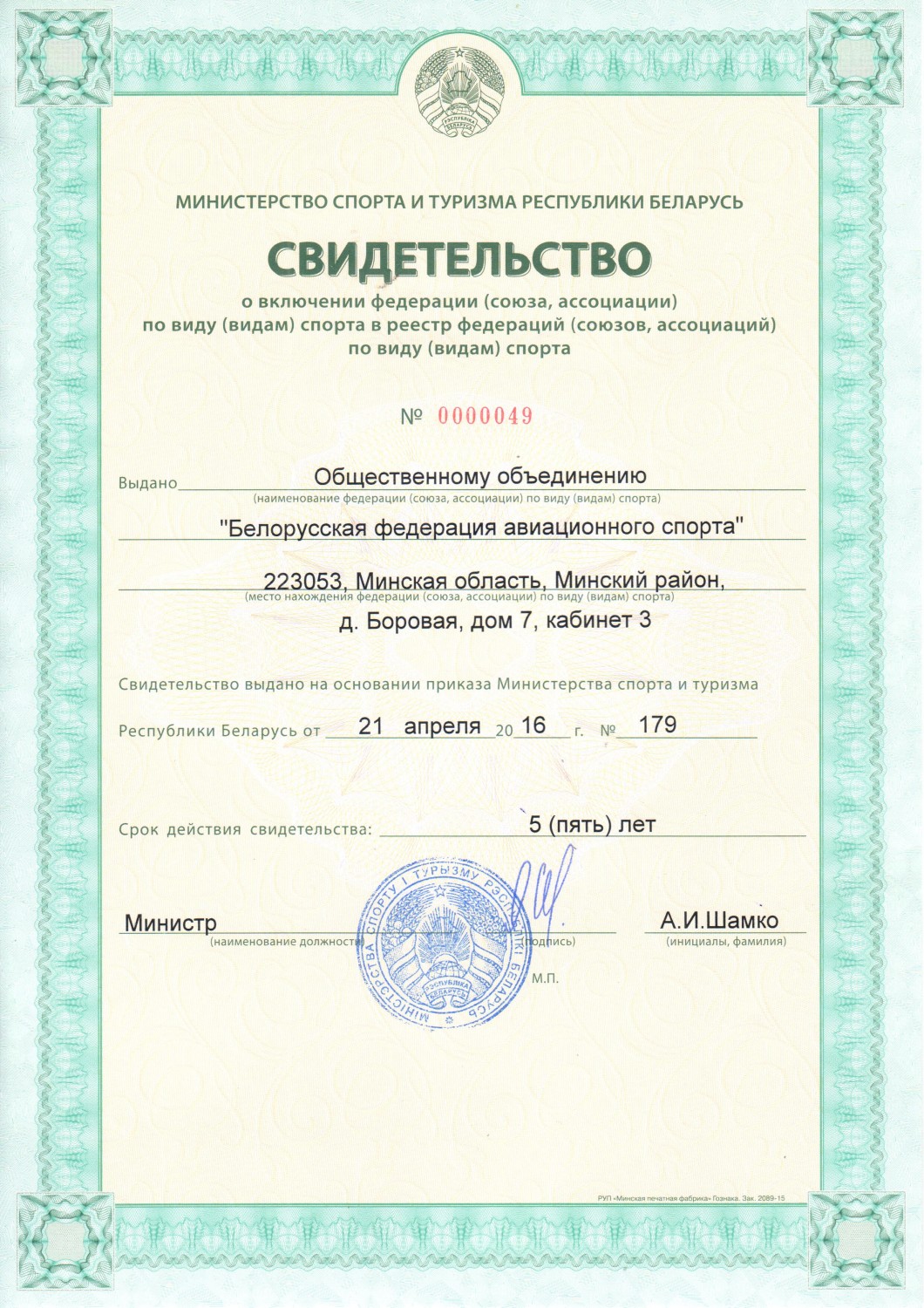 Свидетельство №0000049. Приказ Министерства спорта и туризма №179 от 21.04.2016.
