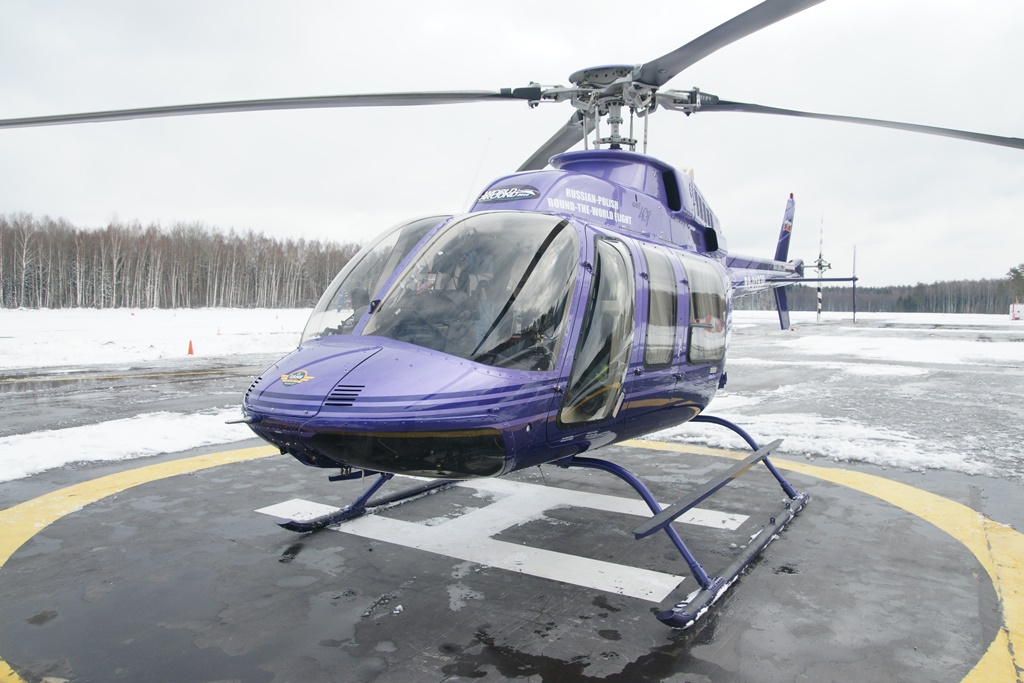 17 апреля в 11:23 на аэродроме Конаково Тверской области экипаж в составе Максима Сотникова, Натальи Сотниковой и Марчина Шамборски поднялся в небо на сверкающий фиолетовым красавце – вертолете Bell 407. Этот винтокрылый американец весом 1203 кг стоит очень дорого – от 4 до 5 млн долларов.