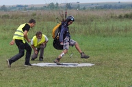 На фото видно что пилот нажимает мишень носком, а не пяткой как парашютисты. Дело вы том, что в парапланерной точности не только запрещено падать, но и даже любое касание земли рукой, коленом или элементами снаряжения – наказывается максимальным количеством баллов в данной попытке. И именно нажатие носком позволяет оставаться наиболее устойчивым при приземлении.