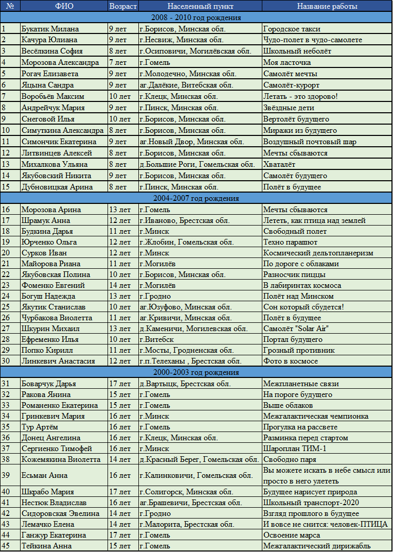 В течение 100 дней дети со всей страны творили на тему «Полет в будущее» и, как результат, более 1400 работ пришло на почту организаторов. Выбрать 45 лучших рисунков оказалось совсем не просто, ведь каждый ребенок изобразил на бумаге свое уникальное представление авиации через десятки или сотни лет. Но все же, путем «холодного» рассудка были выбраны по 15 лучших работ в трех возрастных категориях (всего 45), увидеть которые можно с 12.03 по 23.03 в зоне вылетов 3 этажа (между пунктами досмотра А и В) Национального аэропорта «Минск».