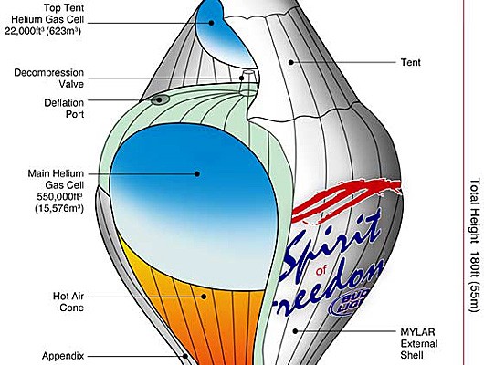 Название шара – Spirit of Freedom (Дух Свободы). Высота шара – 140 футов (43 метра). Ширина – 60 футов (18 метров). Размеры гондолы: 2 на 1.5 метра.